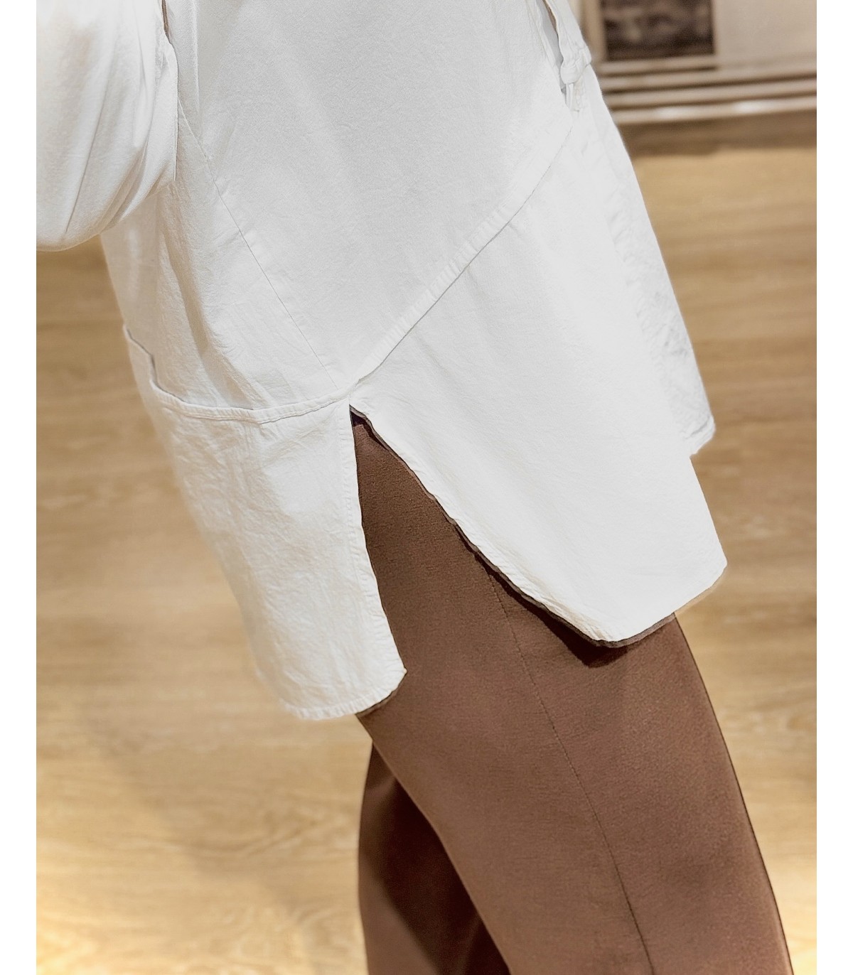 Camisa abotonada, cuello con solapa, manga larga, largo asimétrico, aberturas en los laterales.