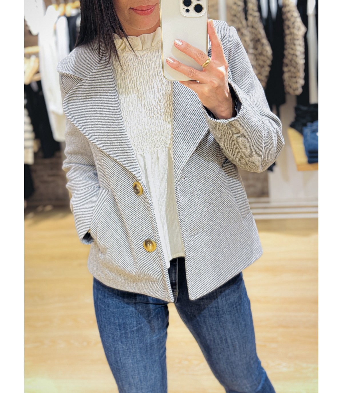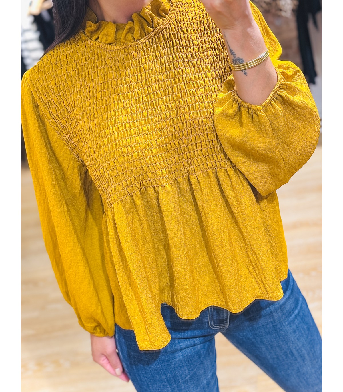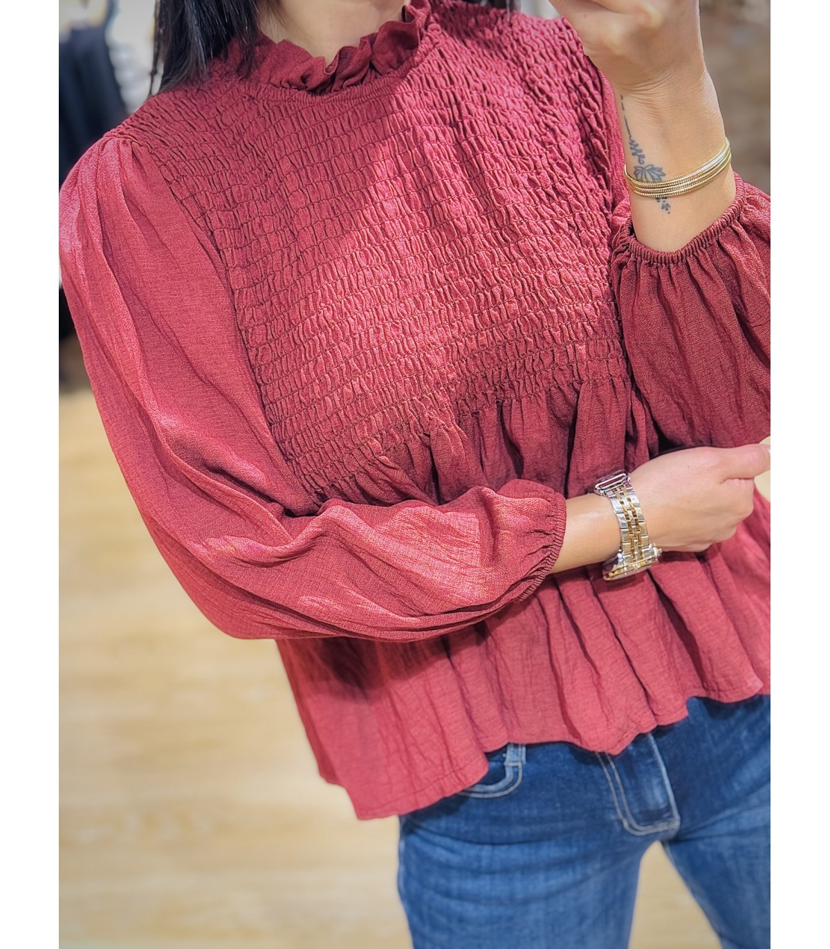 Blusa con cuello redondo ribeteado, cierre con botón en la parte trasera. Manga larga abullonada acabado con goma. Parte delantera desde el cuello hasta la cintura de nido de abeja y la parte baja con volantes. Una blusa que le dará un toque muy estiloso a tu look.