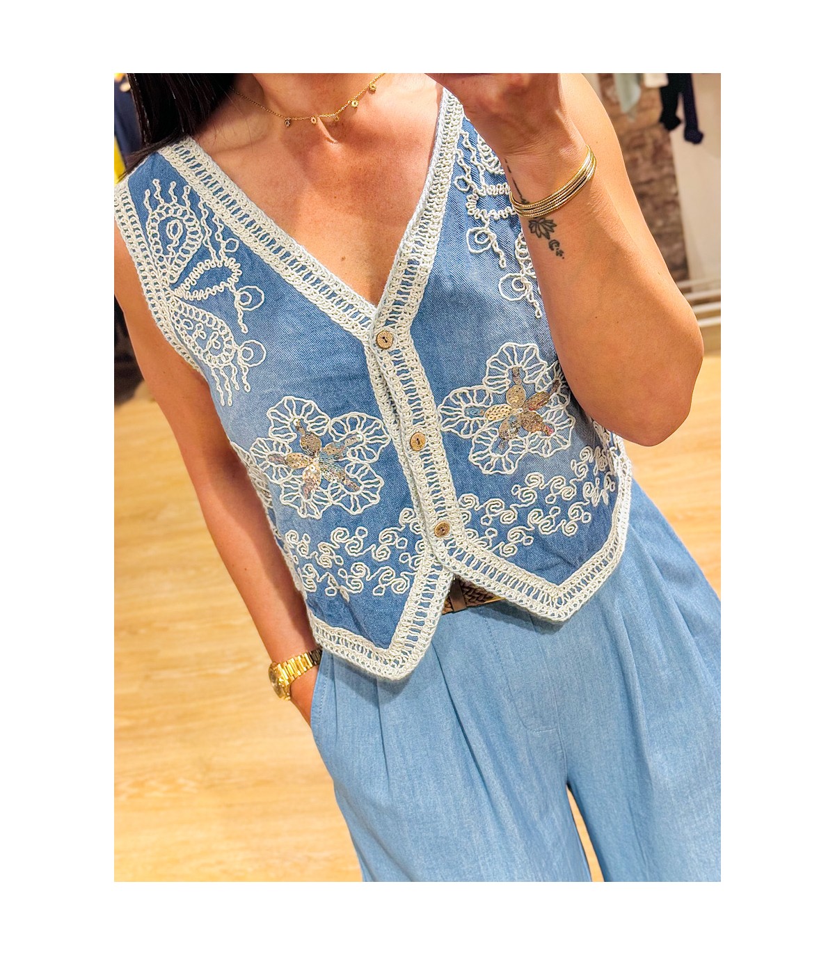 Chaleco abotonado tejano, detalles bordados y con lentejuelas. Corte recto.