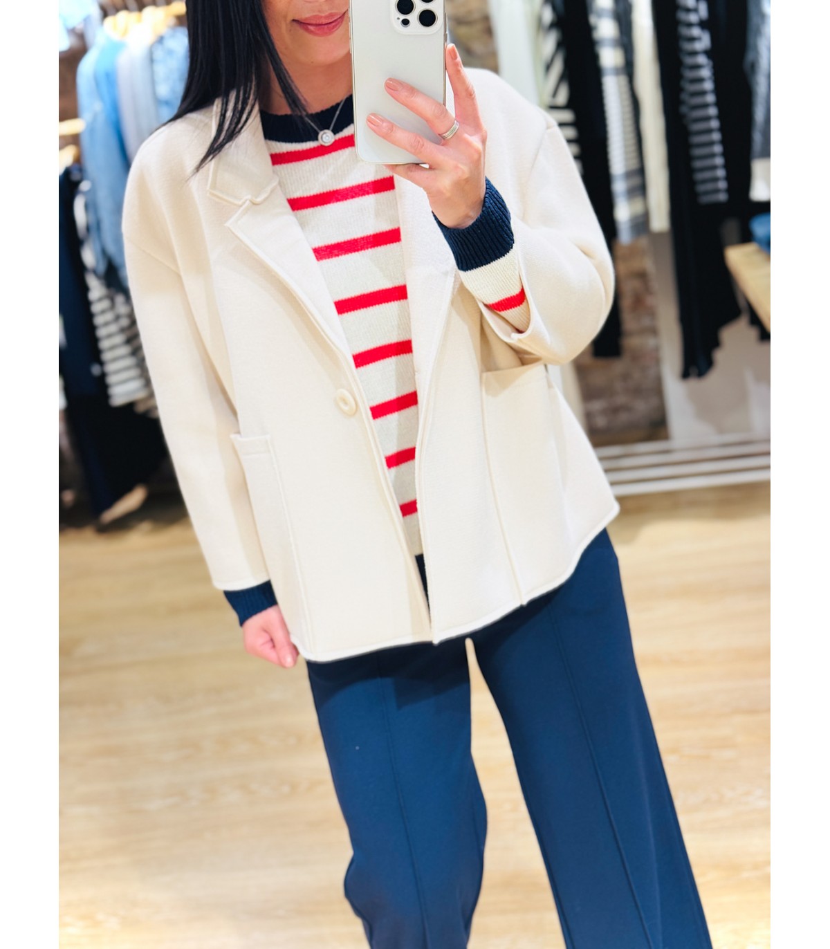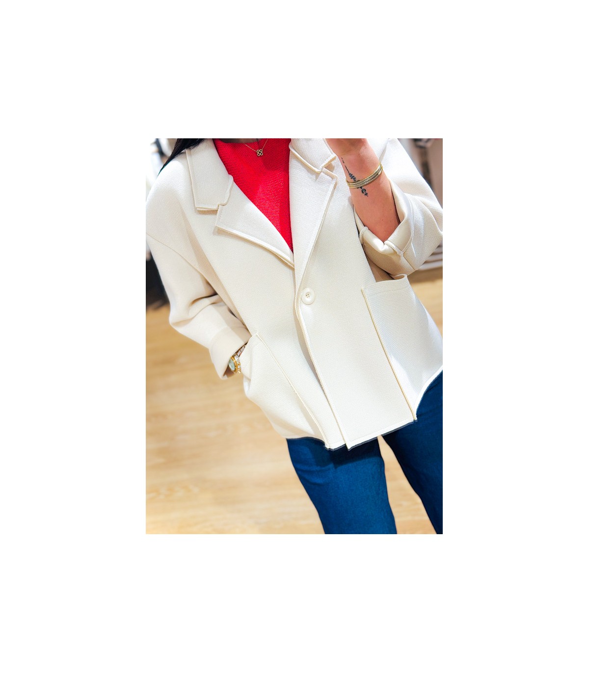 Chaqueta con interior de neopreno, abotonada, cuello solapa, bolsillos laterales, corte ancho, media manga, hombro caído.