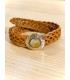 Cinturón de piel tranzada, con la hebilla redonda de metal y detalle nácar en el centro. Regulable mediante gancho en la parte de detrás de la hebilla, no necesita hacer agujeros, por lo que se puede poner en cualquier altura al lo largo de la tira de piel.