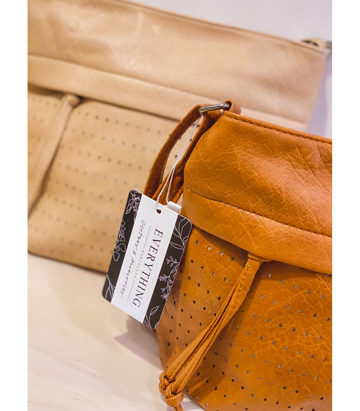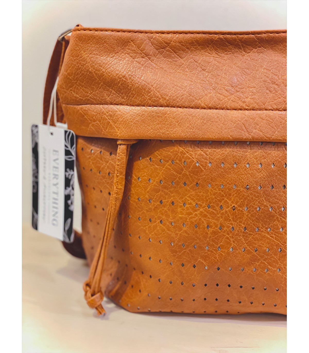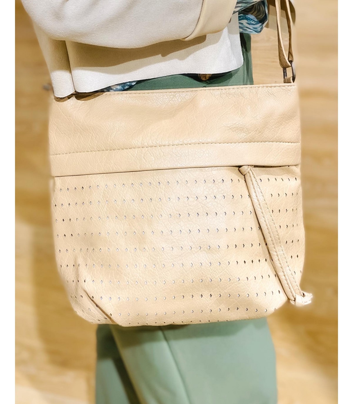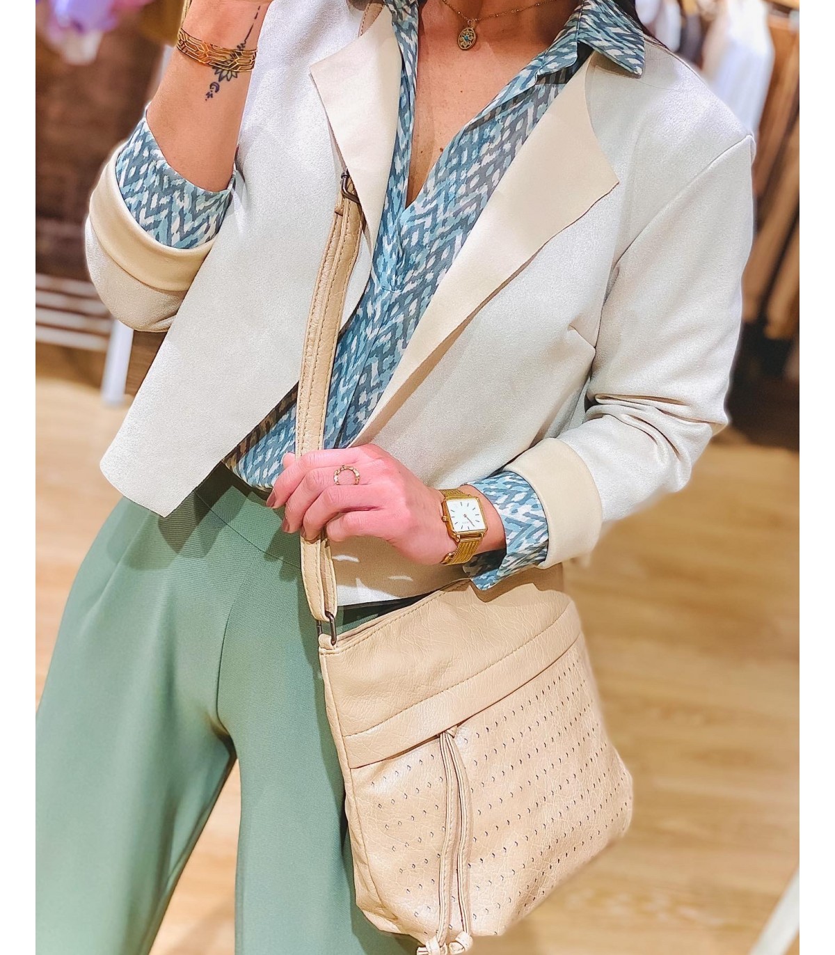 Bandolera skin effect, rectangular shape, adjustable strip, central closure with zipper, front and rear pocket closure with zipper, inner lining and internal pockets.