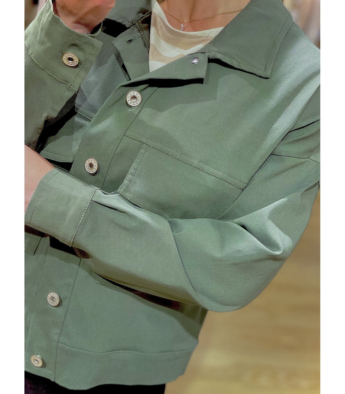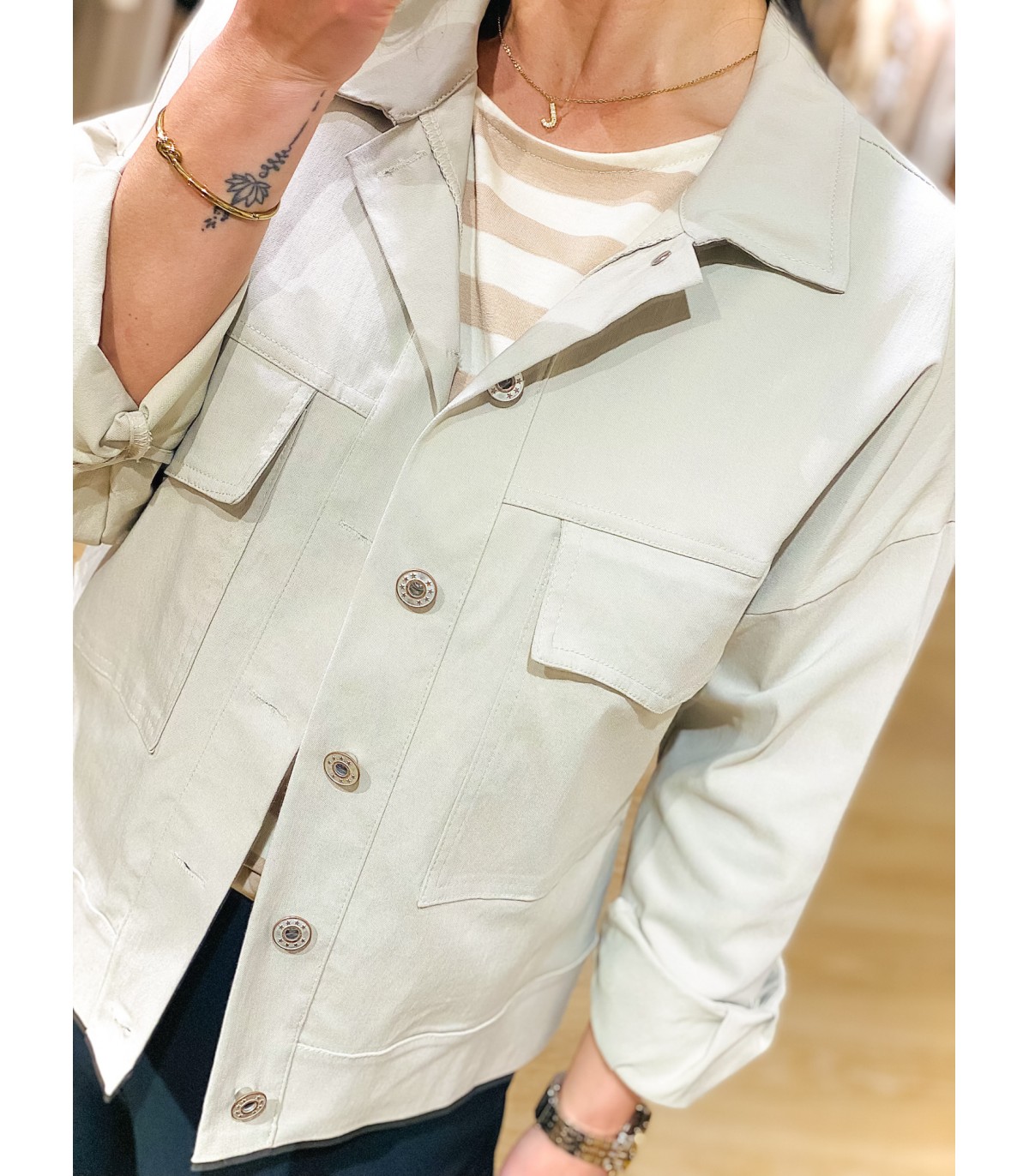 Buttoned jacket, lapel collar, 2 front pockets with flaps, long sleeves with buttoned cuffs.