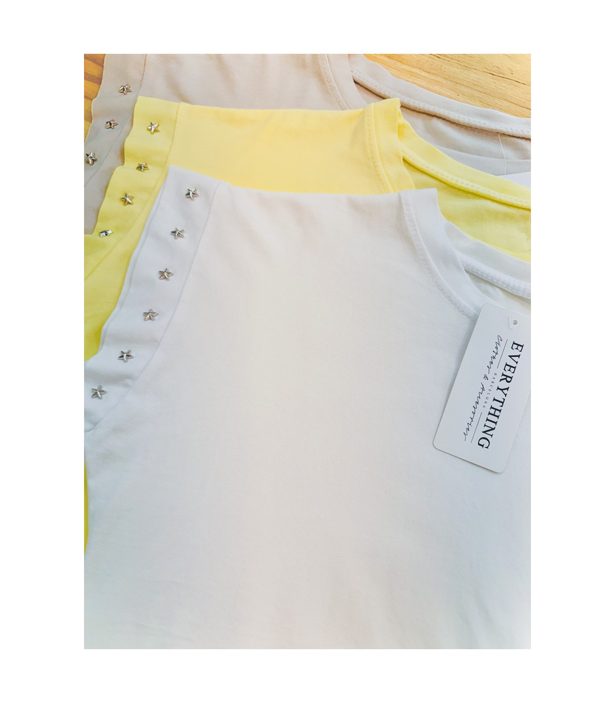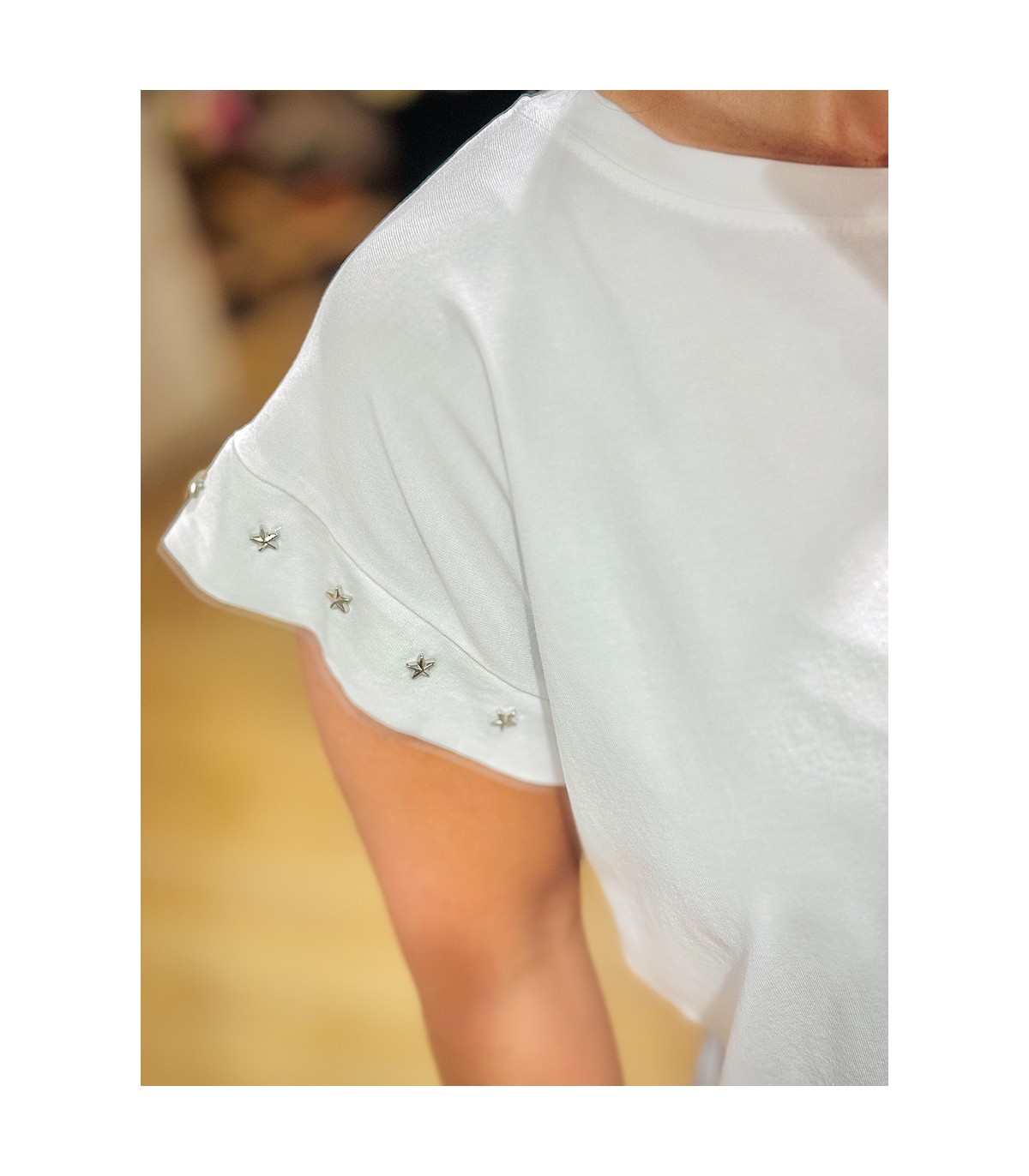 Short-sleeved T-shirt, round neck, star detail on both sleeves. Straight cut.