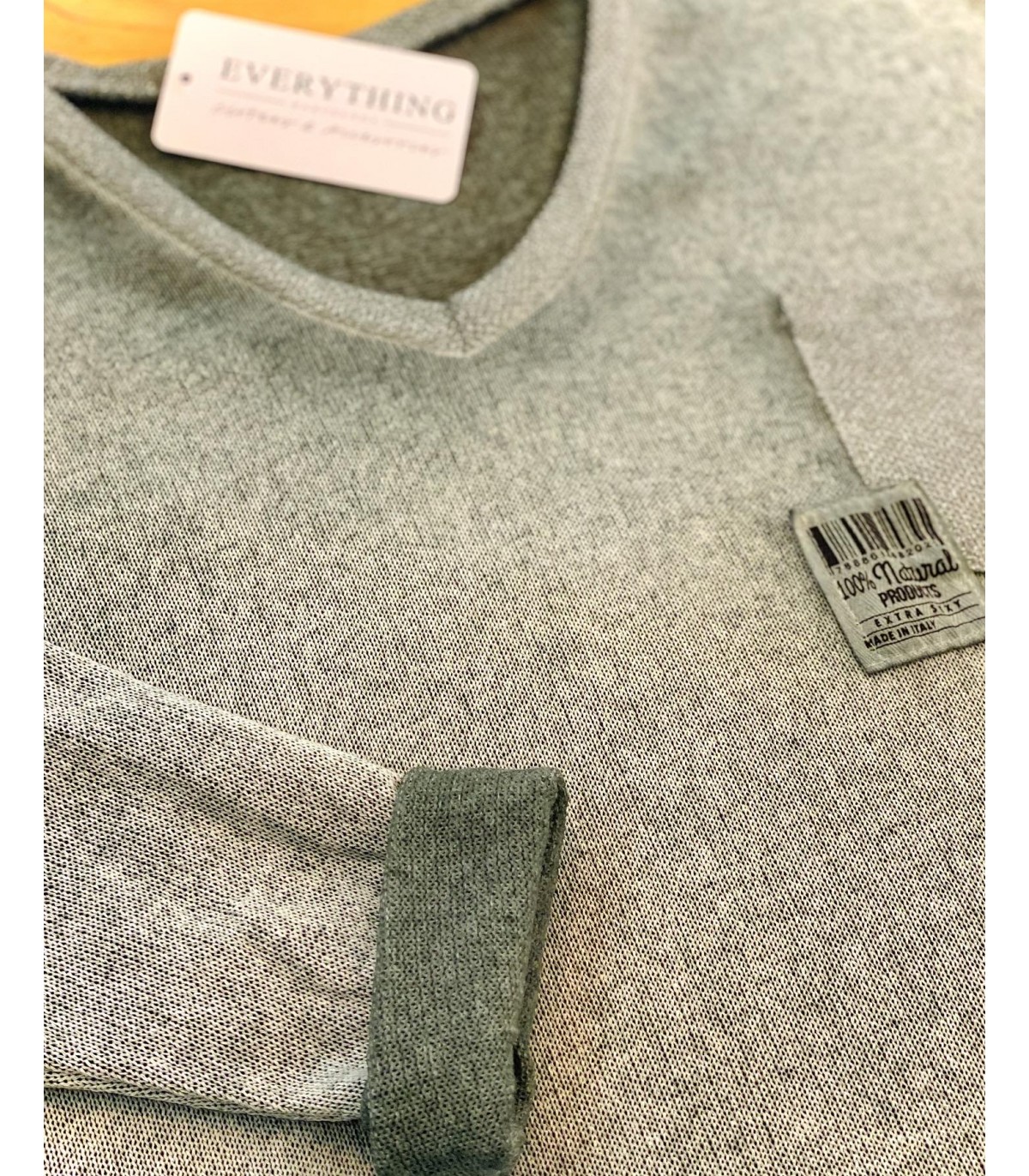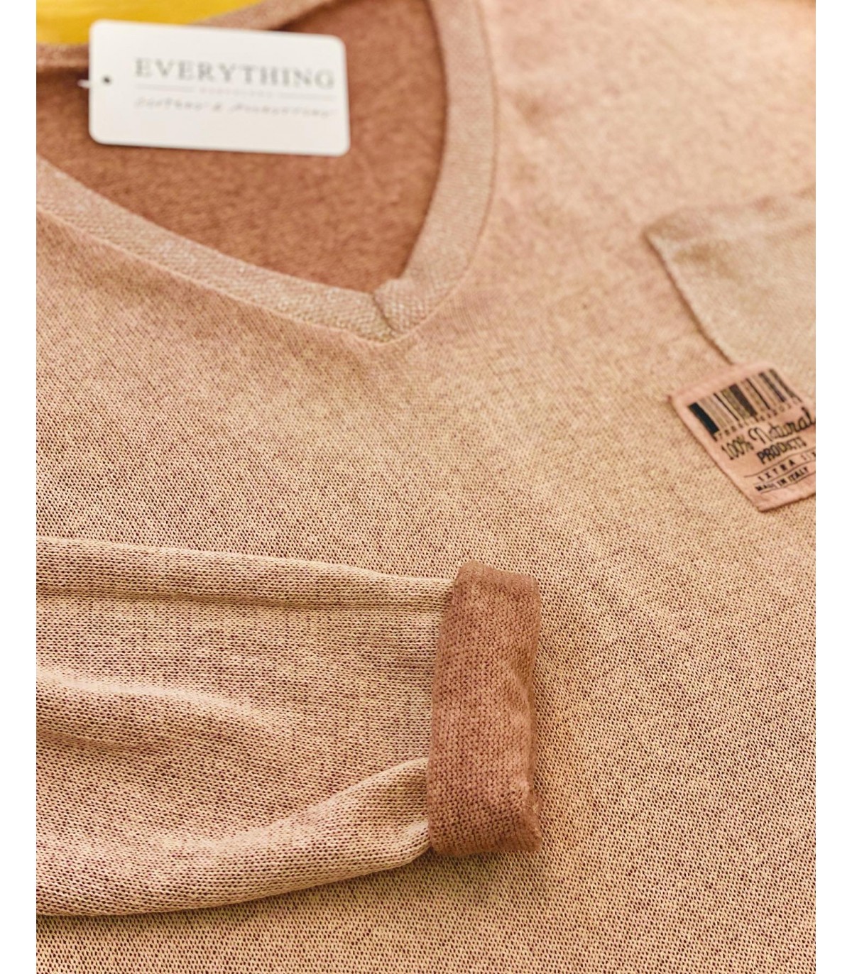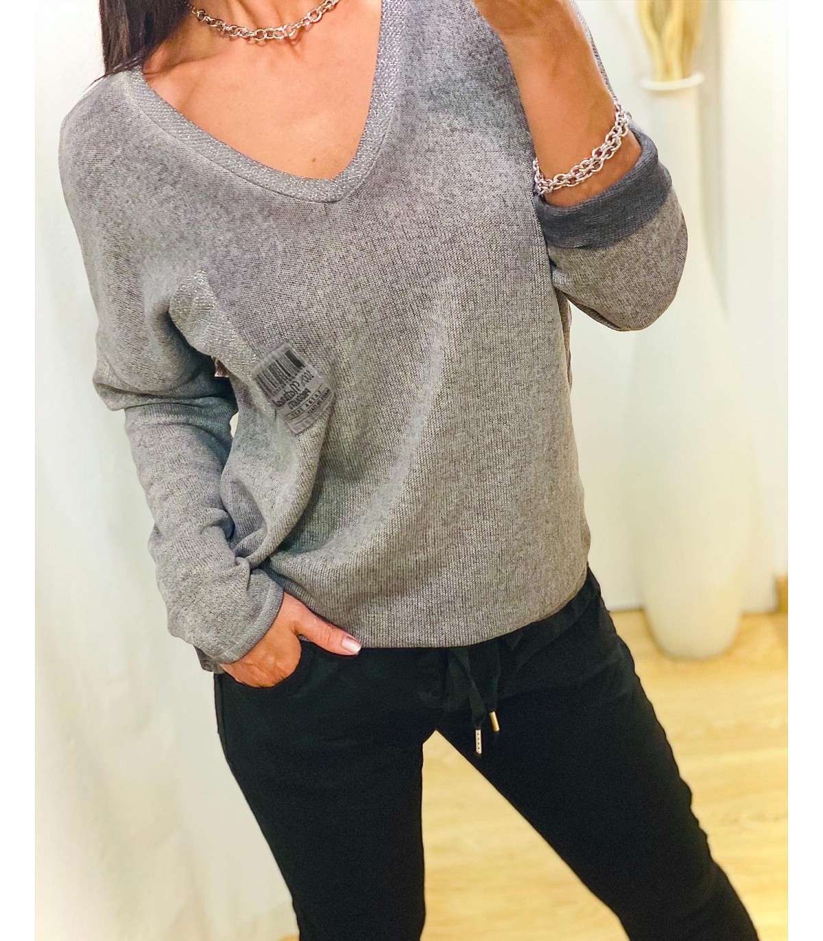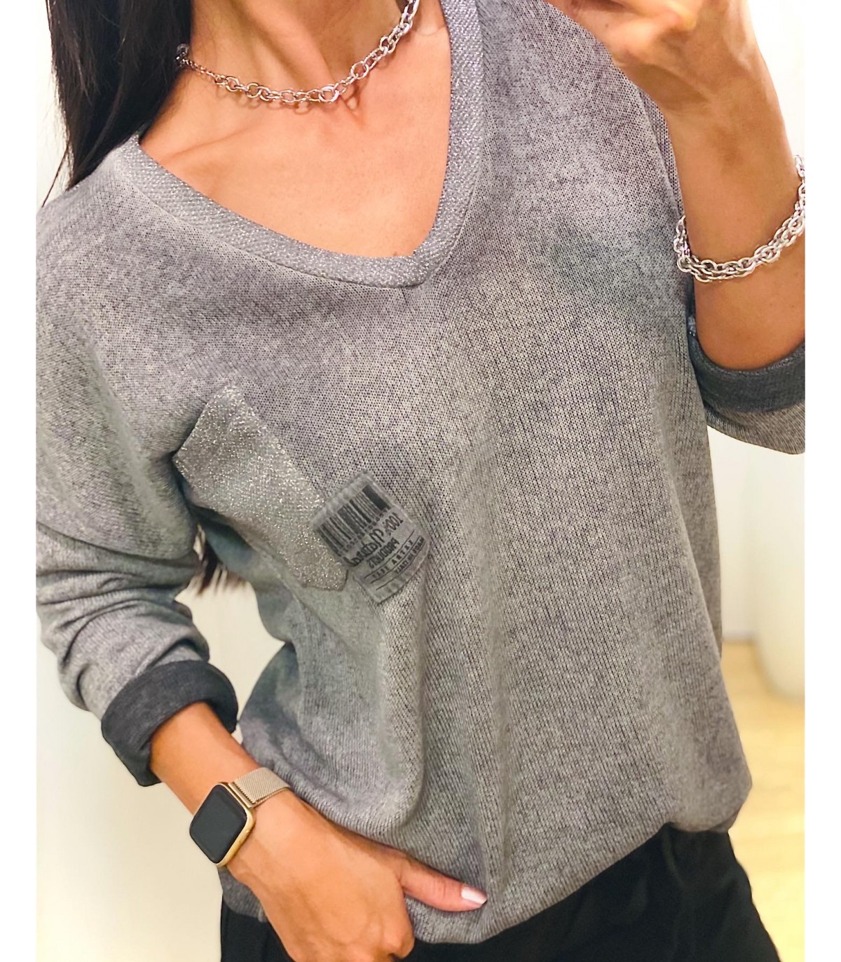 Shiny detail V-neck T-shirt, dropped shoulder long sleeves. Pocket on one side with shiny details. Slightly longer in front than behind.